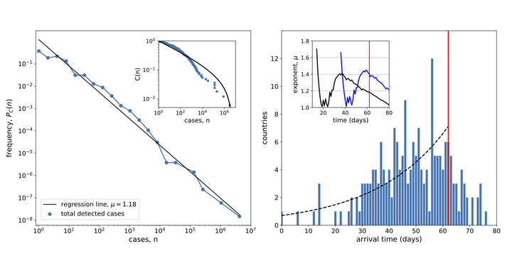 COVID-19 is an emerging respiratory infectious disease caused by the coronavirus SARS-CoV-2. It was first reported on in early December 2019 in Wuhan, China and within three months spread as a pandemic around the whole globe. Here, we study macro-epidemiological patterns along the time course of the COVID-19 pandemic. We compute the distribution of confirmed COVID-19 cases and deaths for countries worldwide and for counties in the US and show that both distributions follow a truncated power-law over five orders of magnitude. We are able to explain the origin of this scaling behavior as a dual-scale process: the large-scale spread of the virus between countries and the small-scale accumulation of case numbers within each country. Assuming exponential growth on both scales, the critical exponent of the power-law is determined by the ratio of large-scale to small-scale growth rates. We confirm this theory in numerical simulations in a simple meta-population model, describing the epidemic spread in a network of interconnected countries. Our theory gives a mechanistic explanation why most COVID-19 cases occurred within a few epicenters, at least in the initial phase of the outbreak. By combining real world data, modeling, and numerical simulations, we make the case that the distribution of epidemic prevalence might follow universal rules.
